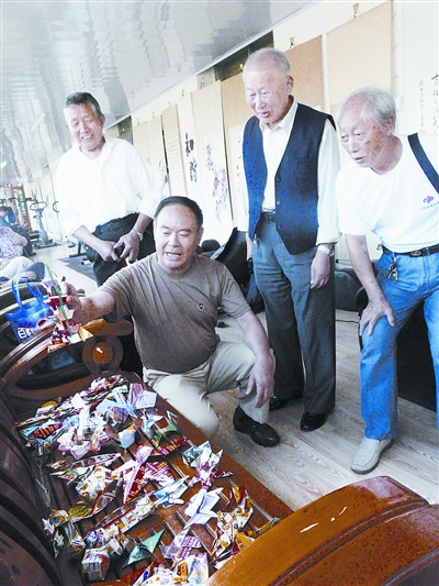 昨日,江汉区老干部活动中心里,来自民族街万年社区66岁的离休干部陈立志(下图左二),向前来观展的老同伴们展示用五彩废纸折叠的五角星、花篮、帆船等20余种创作,倡导人们绿色环保迎佳节。