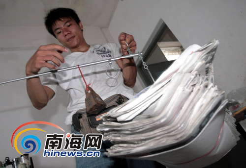 9月17日上午10时,陈修云和吴清壮两人已从海口国贸一家提前预约的单位收购了60多斤旧报纸和一些塑料瓶回来了,“现在刚起步,这已经是一个不小的收获了。”吴清壮擦擦额头沁出的汗珠,不停地用纸片煽着风,坐在马路旁歇脚。