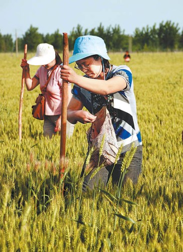 5月23日,河南省安阳市汤阴县花耳庄村大学生“村官”张文红(前)在即将收割的麦田帮助困难农户套种玉米。