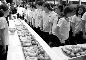 为鼓励学校建立有助学生健康成长的饮食环境和文化,澳门教育暨青年局与卫生局近日在澳门各小学举办了“水果FUN享日”活动。这一天的主要活动就是让学生在学校里吃一个水果,目的是使学生不仅享受吃水果的乐趣,还要养成每天吃水果的习惯。在澳门葡文学校,教师准备了苹果、香蕉、葡萄等新鲜果品,下课后将小学部的学生聚集到操场上排队领取水果,孩子们边吃边聊,非常开心。