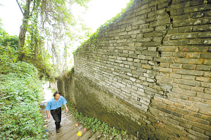 昨日下午5时左右,记者在现场看到,土堆有10多米高。在土堆最顶部,有一条贯通的裂缝,裂缝最宽处有8厘米左右。因受前晚昨晨的大雨冲刷,已无法确认其是否是新发生的裂痕。土堆底部紧靠一堵围墙,围墙外是一条石板路,土堆最高处已堆至围墙腰部。一部分围墙已经不存在——今年3月中旬的一场大雨后,土堆沉降,将这部分围墙推倒。仍存的部分墙体,也已有松动迹象,并有裂缝朝石板路一侧发生倾斜。