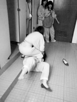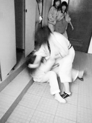 殷琼是上海西南工程学校一年级学生。4月16日下午,她参加考试,题目差不多做完了,同学小成对她耳语:“下课去校门口,有人找你谈话。”殷琼没答应,小成帮她交卷,把她拉到校内一幢大楼2楼女厕所门前,那里还有几个女生在等着。拉扯进厕所后,另一名同学刘幸一边拍她肩膀挑衅,一边让其他女生打开手机摄录。视频记录了殷琼的噩梦,殷琼的母亲向记者出示了这段影像: