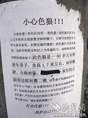 荆楚网消息 (楚天都市报) (记者刘汉泽)“本社区有一位60岁左右老色狼……请女士尤其是女大学生小心严防。”昨日,两名在校大学生在荆州市金龙路南机宿舍楼道和电线杆上,张贴举报色狼的告示。