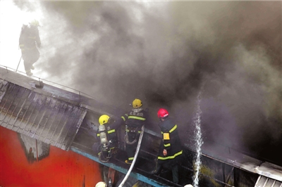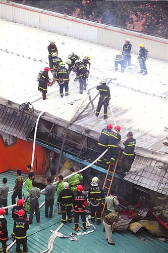 采石路消防中队和首体南路消防中队出动10辆消防车相继赶到,消防员向屋顶喷水后,攀上楼顶凿开屋顶彩钢板向内喷水。很快,明火被扑灭。消防员需一人指引进入教室,小石便自告奋勇领路。小石说:“教室有一个篮球场大,里面有音响设备和椅子等物,当时屋内浓烟滚滚。”他随即撤出,消防员继续进行扑救。