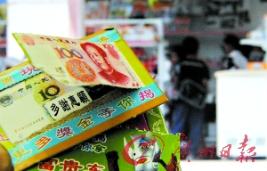 记者了解到,孩子们购买的“地下彩票”(见上图,记者于涛摄)全都是5角一张。有的上面印着人民币图案,刮开后是什么面值的钞票就能得到多少钱,有的就只能换到小玩具。眼看到了上学时间,孩子们还在不停地刮奖。