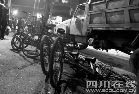昨晚7时许,记者赶到现场时看到,事故发生在蒲江中学大门右侧,蒲江交警大队派来的一辆拖车在清理现场。在学校大门右侧的路上,停着一辆外观变形的出租车,出租车后方就是肇事的橙色货车。货车旁边的人行道上一片狼藉:碾烂的蒸笼、一地压扁的菠萝,以及车辆破碎的零件。人行道上还躺着一棵行道树,已经被连根拔起。