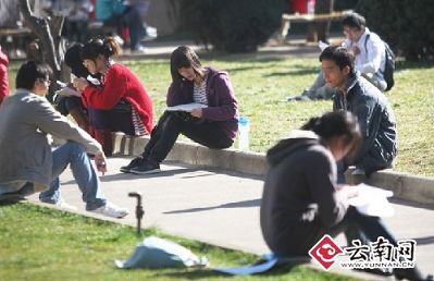 记者昨天在昆明多所高校走访看到,和往常相比,临近寒假的大学校园变得异常热闹。除了拥挤的图书馆、教室外,校园内的草坪、花园等公共场所聚集了许多埋头苦读的学生,上前一问,大多数人都是在准备已经到来的期末考试。记者从其中某高校采访了解到,为了能在图书馆内占到一个安静的位子,有同学在天刚蒙蒙亮时便提前出动,生怕没地方看书学习。而占不到位子的则去校园内的树林里晨读。