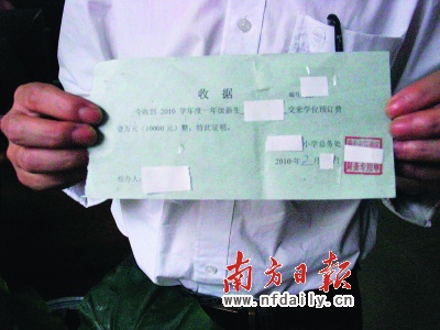 近日,本报接二连三接到家长报料,称大良的民办小学提前催缴1万元“学位预定费”,具体涉及到大良所有的4所民办小学。市民李先生出示了其在2月27日缴纳的1万元现金收据,在一张粗糙的纸上简单地打印了“今收到2010学年度一年级新生××交来学位预订费壹万元,特此证明。”落款为某小学总务处、经办人的手写签名及该校的财务专用章。据家长透露,学校从2月20日左右即以打电话、发短信的方式通知所有的新生家长在“两天内必须缴纳学位预定费,否则学位不保。”“9月份开学,现在就开始催缴,太离谱了。”李先生说。