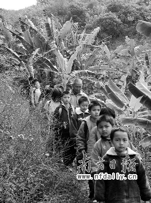 6点20分,近10个小孩排成一队,在十九公的护送下,往山下赶去。大概经过20多分钟的路程,“浩浩荡荡”的队伍来到学校,此时的学校还沉睡在美梦当中。
