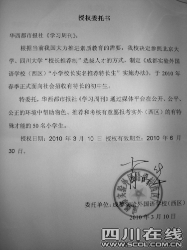 “一个学生不能仅仅只做考试一件事情,还要多做几件事情,例如自身综合素质的培养、人格的塑造、视野的开拓等,因此,‘特长生’是我们需要的人才,同时也是社会的需要。”实外(西区)的校长肖明华日前郑重委托华西都市报《学习周刊》为其招收2010年“小升初”艺体特长生。校方和华西都市报《学习周刊》签订了一份委托协议(如图)。协议表明将在今年春季破格招收50名由小学校长推荐的特长生,依托于华西都市报《学习周刊》的公信力,借助媒体平台发布报名、审核和录取原则及名单,其间保证公平、公正、公开。