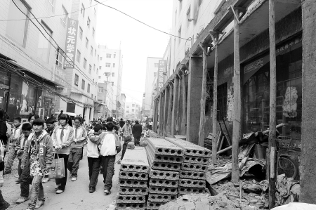 本来只有四五米宽的街道,施工方将水泥、沙石统统堆在路上,加上沿街摊贩的占道,道路宽度仅容一人通过。列队的小学生从建筑工地上穿行,几个奔跑的学生还钻到工地里嬉戏、打闹。