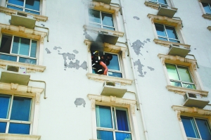 昨天早晨5点56分,位于北京市大兴区榆垡镇首都师范大学科德学院一女生宿舍发生火灾,由于火灾产生的烟气太大,两名女生跑到了窗户外侧的阳台等待救援。火灾发生后,师范大学科德学院的负责人迅速组织人员,疏散楼内学生,并利用灭火器和墙壁消火栓进行扑救,但浓烟滚滚,扑救人员不能靠近。榆垡消防中队官兵到场后立即佩戴呼吸器,进入宿舍内灭火,并成功救出两名被困女生。 邓春雷 郑喜超摄