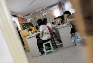 “挤是挤了点,但是为了学手艺,没有办法。”一名来自四川省巴中市的女生说,学校宿舍的房租便宜,一个月只要150元,班里大多数外地学生都愿意住宿舍。她说,宿舍大概住了七八十名女生。