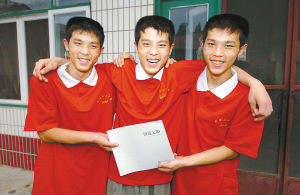 家住山东省高密市柏城镇小河崖村的三胞胎兄弟赵凌霄、赵凌汉和赵凌云,在今年的高考中分别考出了616分、617分和618分的三连号成绩。兄弟三人一志愿报考了中国石油大学,并有望被录取。新华社记者 范长国摄