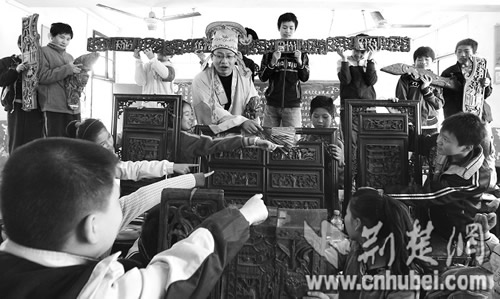 荆楚网消息 (楚天都市报) (记者李樵 通讯员曹斌)一位老师身穿古装跳上课桌,一手摇着折扇,一手举着雕花木窗,讲解古代建筑的艺术价值。旁边的课桌上,几位学生手举雕花窗扇和横梁,“还原”古式木构建筑……