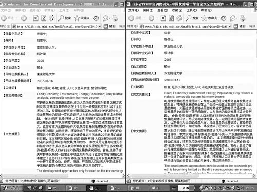 昨天(25日,下同)下午,记者按照这名网友提供的信息,登录中国知网,分别下载了这两篇硕士论文。