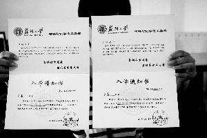 采访中,张女士的父亲向记者透露,“一个来自山西的小女孩竟然收到了两份《入学通知书》,而且专业还不同。结果,来校报到时,校方称两通知书全是假的。”