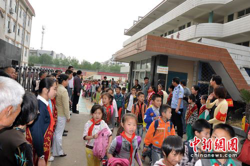 今天,记者为此来到徐州东区最大的黄山中心小学了解情况。陈书强主任介绍说,学校已经在2天内紧急召开5次安全会议,制定多项有效安全措施,已把安全防范级别提到最高,精心构筑校园平安防线。在学生出入的要道口设立交通安全警示牌,给每位家长送上《家校携手,共建平安和谐校园》一封信,聆听家长对学校安全工作的建议。分管安全工作的黄副校长说,他们学校的监控探头由4个增加到8个,学校传达室内增加了能直接报警的CK安全报警系统。学校紧急成立了由15名队员组成的校园防暴突击队,一旦有案发,五秒之内队员们就能紧急集合。黄山中心小学5个校区的辖区派出所特别派出2名警察与社区6名综治巡逻人员每天上下学时间一起护送孩子们进出校园。