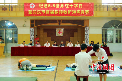 中新网武汉5月6日电(记者 张芹) 规定时间内,完成对“伤者”的心肺复苏,头部、单肩、前臂骨折止血、固定等包扎工作……6日,一场别开生面的教师救护技能竞赛在武汉市武昌区实验中学拉开帷幕。