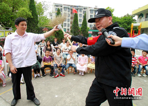 中新网湖州5月6日电(记者 赵晔娇 通讯员 郭楼儿)“遇到危险分子,扫把都是很好的武器。”6日中午,浙江省湖州市吴兴区巡特警携手湖州市妇联童星幼儿园,在童星园紫云校区开展了一场主题为“为了孩子的笑脸,我们共同守护”的校园安全警务广场活动,宣传校园安全防范知识。同时,建立了一支由公安民警、社区干部、学校老师、保安人员和学生家长五部分组成的“守护天使”队伍。