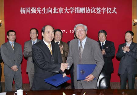 昨天清华大学接受了3000万人民币的捐款,前天北大也得到了相同额度的捐款。这些捐款来自碧桂园集团董事局主席杨国强,他也是不久前《福布斯》中国富豪排行榜首富杨惠妍的父亲。根据协议,这些捐款分别设立了“北京大学国华杰出学者奖”基金和“清华大学国华杰出学者奖”基金。