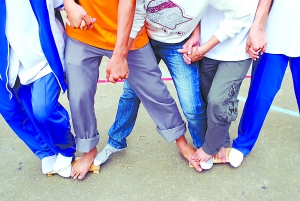 中学生在“冰海沉船”拓展游戏中体验坚韧、合作、友爱精神。
