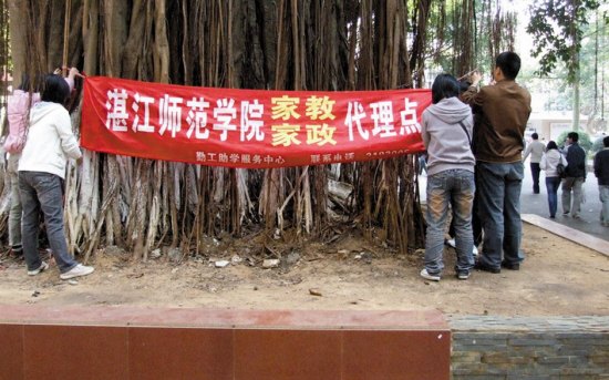 据了解,湛江师范学院勤工助学服务中心设有家政部和热线电话,从周一至周日每天上午到下午,都有学生干部义务接听电话,为雇主提供服务。而校外也有企业打出“大学生家政服务”牌子招揽业务。不过,学校与企业的目的不同,前者是为了帮助困难大学生渡过难关,而后者则是以赢利为目的。