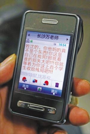 3月7日19:35,沈雄伟收到了万永娟的短信:“姓沈的,你他妈的真不是个东西!你这是自己在找死!那就看谁的损失大吧!!!你就等着为你这上百个学生收拾残局吧!!!”