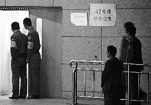 昨日傍晚6时35分,47号学生公寓南侧地面上横躺着坠楼男女的遗体,其中女孩身穿桃红色睡衣,身下有大片血迹,男孩身穿灰色T恤衫,下穿牛仔裤。