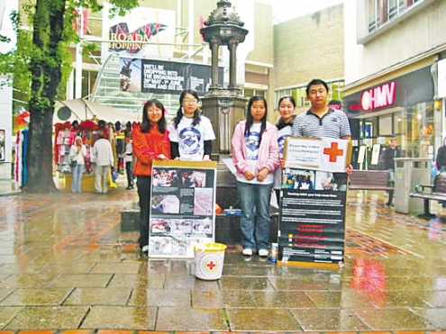留学生们于是都收起了伞,学生们在雨中向路人们宣讲着震区的故事。诺丁汉市民们被感动了,一些市民不拿T恤就直接往钱箱里塞钱,有的市民甚至收起伞,陪学生们一起淋雨。