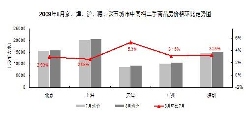 从图表中的数据可以看出,2009年8月京、津、沪、穗、深五大城市的中高档二手房价格均呈上涨走势。在上述五大城市中,8月份中高档二手房上海和北京分别上涨2.58%和2.93%。总体来看,2009年8月五大城市中高档二手商品房在市场成交活跃的促进作用下,价格再创新高。价格上涨最明显的依然是天津,上涨了5.3%。其次是深圳和广州,分别上涨3.25%和3.15%。