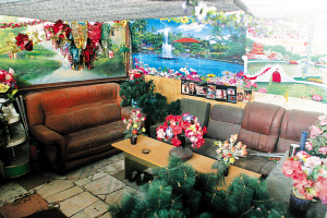在建和桥下东侧,是一排用废旧木板搭建而成的房屋。房屋的“墙”上挂满了年画、牌匾等装饰品,门口摆放着一些捡来的盆景花卉。房屋的门锁着,隔着门缝看到,里面分三间,中间是客厅,摆放着沙发、茶几,客厅的南边是卧室,北边一间是储藏杂物的。