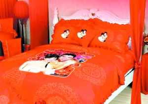 由雅芳婷推出这种数码床品系列,采用了数码印染技术专版定做,既有粉色的西式也有大红色的中式,而且只需一个月时间,就能把被子或枕头变成一款独一无二的结婚纪念品。试想一下,每年的结婚纪念日把它拿出来,重温一下新婚时的甜蜜,该是多么温馨浪漫啊。