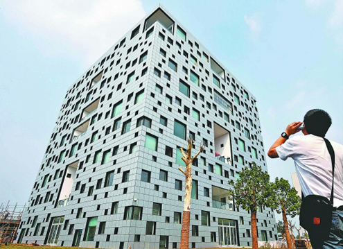 昨天,在金华市金东新区一幢“怪”楼前,过往市民纷纷驻足观看,一间房会有21个窗户?