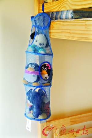 “因为地柜不适合收纳物件。”电视柜下摆了一台音响,还有一台WII游戏机。各种碟片则放在下面的抽屉中。儿子喜欢的各种车模整齐地摆在电视柜左上角的一个空格中,“他的玩具很多,车模摆在这里,另外还有几处地方。”关小姐走到餐边柜前,拉开底层的侧门,里面是小孩的篮球、足球等球类玩具。而在小孩的卧室,则用四个塑料箱装着其他的玩具,床头的网兜和床上,则是收纳公仔的地方。