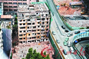 “一点不用担心,绝对百分百安全。”现场负责拆除的工人张师傅介绍,因为八层楼紧贴高架桥,为保证拆楼不殃及桥体,所以决定将大楼分片拆除。一周前,工人给大楼凿了五六道缝,凿通靠上的四层,每间房都要开口,到时再由机器用绳索从不同方向分别拽倒。张师傅说,这栋待拆的八层楼几日后便可放倒。