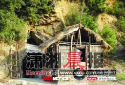 从视频资料和照片中可看出,该房子坐落在一个小山脚下,在一个因采石废弃的山洞前,房主搭建了一个简易房子,底部用红砖砌了约半米高,然后用竹子编成的栅栏和旧竹竿围成四方型,房顶呈“人字型”,是用稻草盖的,前面和侧面各有一扇面。这就是房主的生活起居室,里面摆着锅碗瓢盆等日常生活用品。
