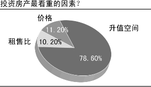 而对于房产投资,大部分投资客仍然最关注房产的升值空间,对于目前的价格因素并非投资客们最关注的焦点。同时,租售比是最不被房产投资者看重的因素,调查中仅有一成投资者表示了认可。而专家认为,炒房是淘金的好工具,同时也是抵御通货膨胀的最佳投资产品之一。但是,如果房产价格处于低潮期,则重点是关注其本身升值空间,房价高峰期的房产投资重点因放在租金回报率上面了。