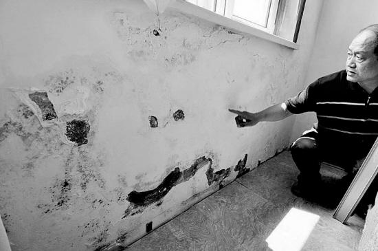 在小区内11号楼4单元11楼2号于女士家,记者一进去就闻到刺鼻的霉味。因漏水严重,客厅的棚顶除了有渗水的痕迹,墙皮也已翻了起来,并出现了长毛情况。于女士说,她花了34万元于2005年购的房子,第二年就开始出现漏水、墙壁长毛的情况。没办法,她一家在去年搬了出去。但很多的住户只能继续生活在房屋漏雨、长毛的环境当中。记者在走访11号楼、12号楼的近10家住户时发现,家家墙壁都有类似情况。“一次我正与孩子吃饭,没想到饭厅棚顶的墙皮就掉下来了……”83岁的高淑园(音)老人说。