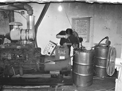 下图:汉正街华贸皮具箱包城3号楼内,一位业主在家中用柴油机发电。(记者陆涛)