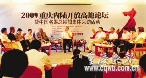 昨日,“2009内陆开发高地论坛”在我市举行,国内十家知名媒体的总编辑应邀到会,他们包括了南方周末总编辑向熹、第一财经日报总编辑秦朔、21世纪经济报道总编辑刘洲伟、中国新闻社社长刘北宪、新浪网总编陈彤、中国周刊执行社长朱德付、新京报总编辑戴自更、新闻出版报社长姜军等。老总们集体采访了市委常委、常务副市长黄奇帆,请他阐释“重庆怎样才算建成内陆开放高地”,黄奇帆回答说:“我个人认为,将来重庆成了长江上游的经济中心、金融中心和贸易中心,内陆开放高地就算建成了。”