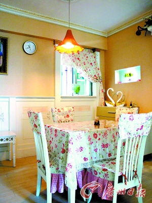搭建豪华壁板的餐厅就布置在与客厅相连的另一端,设计温馨而和睦。墙上特意制作的凹陷的壁庵,承担了作为壁灯用作照明和装饰的作用。英格兰风情的粉红碎花餐桌椅,散发着温馨素雅的田园气息。餐柜上是用烤金瓷制成的工艺品命名为“心心相印”,两只如情人般缱绻的瓷白天鹅,纤长的颈项形成一个心形。微风掠过,窗台上的舞女兰轻轻摇曳,跟随着窗帘细腻的节拍舞动多姿的身影。