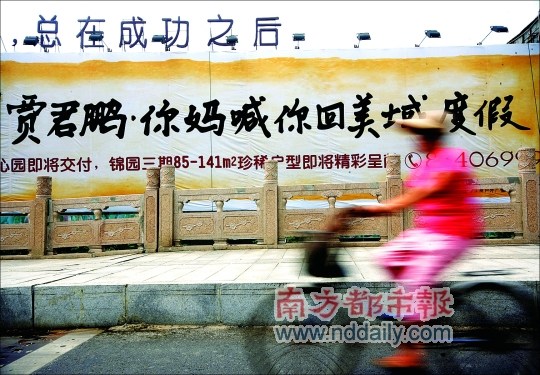 在汉中门大桥上,一个大广告牌煞是醒目,之所以引起路人的注意,是开发商巧妙地将风靡一时的网络语“贾君鹏,你妈妈喊你回家吃饭”,偷换成了“贾君鹏,你妈喊你回美域度假”。昨天在南京本地的网络社区里,这一雷人的广告照片已经流传开来。