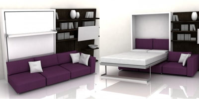 小户型空间较小,需要把客厅和卧室安排在一个空间中,这种灵活组合的家具就非常适用了,将搁架放下就是床。客人来访一定会询问床在哪里的?