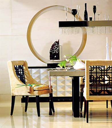 绒布的椅背围着木条交织的东方图腾;墙边置物柜上的圆环里框着小件的自然雕塑品;长方灯上排着高矮相间的深浅酒杯;玻璃压着的是丝绸料上典雅的手工刺绣,透出一股清新的中国风。