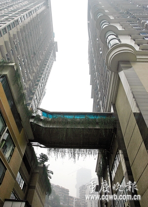 渝中区嘉滨路有一对“姊妹楼”,一曰华庭锦园(以下简称锦园),一曰华庭嘉园(以下简称嘉园),之间有一座天桥,远远望去,就像一只巨大的手,把两栋楼连接起来。
