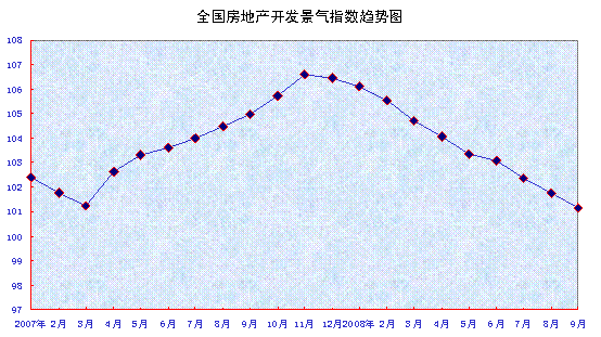 中新网10月21日电 据国家统计局网站数据显示,9月份“国房景气指数”为101.15,比8月份回落0.63点,比去年同月回落3.84点。