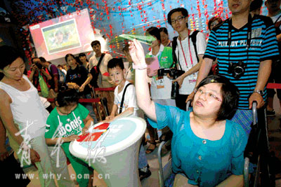昨天上午,在世博局相关工作人员的安排下,不需要排队,通过媒体工作人员专用通道,小邢怡第一时间入了园。8点50分,邢怡来到了向往已久的中国馆门前,早已等候着的中国馆副馆长龚惠斌迎了上来,热烈欢迎小邢怡来中国馆,龚惠斌副馆长还送了小邢怡一份小礼物,精致的世博徽章,还有介绍中国馆的精美图册。小邢怡傻傻地笑着说不出话,咧着嘴开始了奇妙的中国馆之旅。后来小邢怡悄悄告诉记者,一直看新闻上说中国馆预约券有多么的难得,参观中国馆有多么的不容易,她根本没想到自己能那么幸运,所以刚进中国馆的那会儿,感觉像做梦一样。