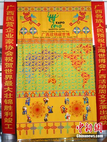 中新网南宁7月7日电(记者曾德军)中国工艺织锦大师谭湘光和她领衔织锦的8名“织女”,经过近百日的辛勤劳动,7月7日织就世界最大壮锦,这一壮锦长6.2米,宽3.6米。据悉,这幅世界上最大的壮锦将献给上海世博会。