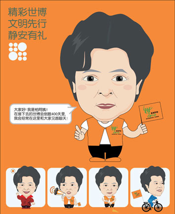 柏万青“化身”卡通人物,成为“柏阿姨讲世博”、“柏阿姨讲文明”等系列漫画的主角;世博宣传品定点投放到静安区23个白领午餐点;8支志愿队伍3000余名志愿者走上街头、深入社区……今天上午,静安区“公共秩序日”集中行动在静安公园启动。